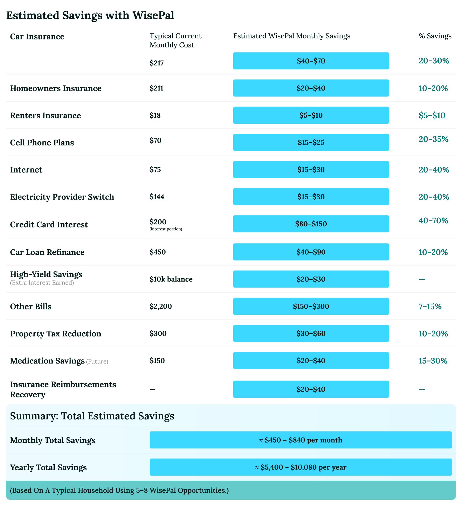 The amount WisePal can find varies from household to household, depending on your bills, location, and life situation. The easiest way to know your savings potential is simply to check.